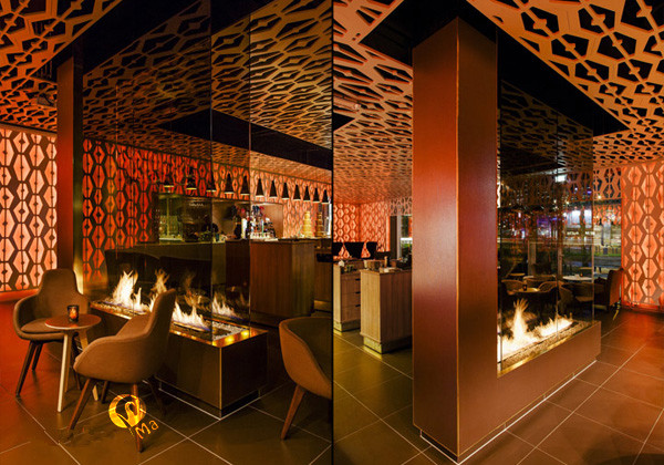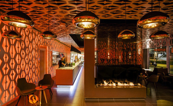 店名为Weekend的周末酒吧,面积为230平方。大面积的镂空雕刻装饰布满整个酒吧空间。除了顶部没有暗藏灯光外,酒吧的其余墙面均装有可控制色彩的灯光,这样让自然的白天与黑夜,融入到Weekend酒吧中来。