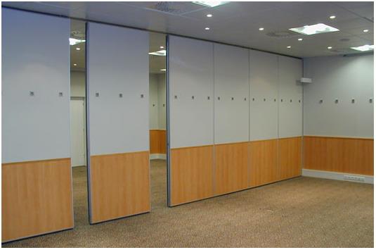 活动隔断一般由轨道、水平轮、密封条、外框、基准面材、隔音材料、传动杆、密封胶条等几部分组成。