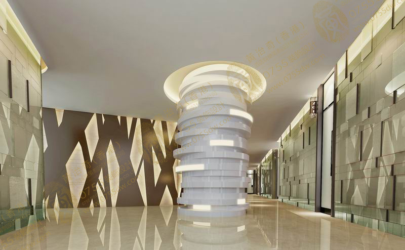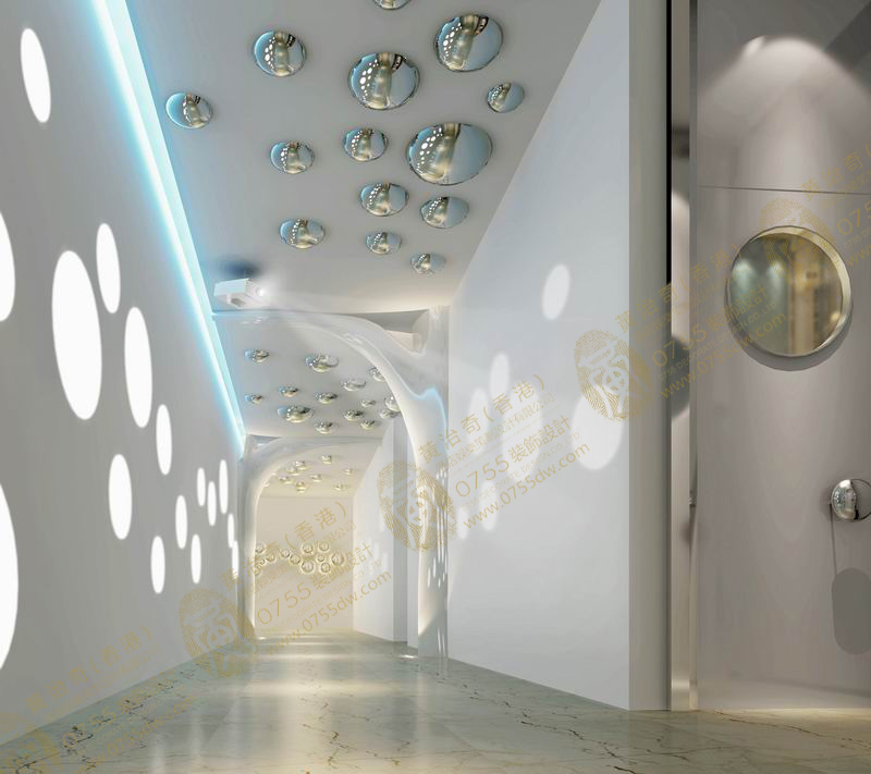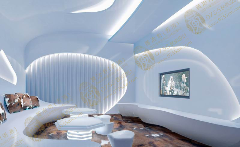 让人充满幻想和向往的未来空间,给人不断的惊喜,符合了KTV时尚、绚烂的特点,同时也提高了用户体验感。步入大堂就给人一种新奇与未来的感受,采用了曲线、曲面等不规则